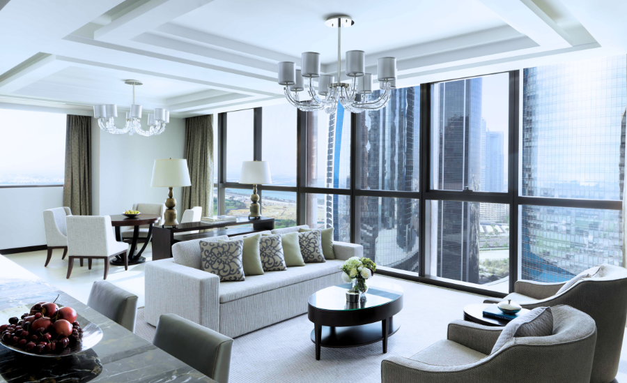 The 30 One Bedroom Deluxe Residences are designed and decorated for pure comfort with contemporary furnishings with an elegant style. The spacious residence 94sqm (1011sqft) features an impressive living and dining area, separate bedroom with a King bed, a large marble bathroom with walk-in shower and tub and breath-taking panoramic views of the Arabian Gulf and the Presidential Palace.